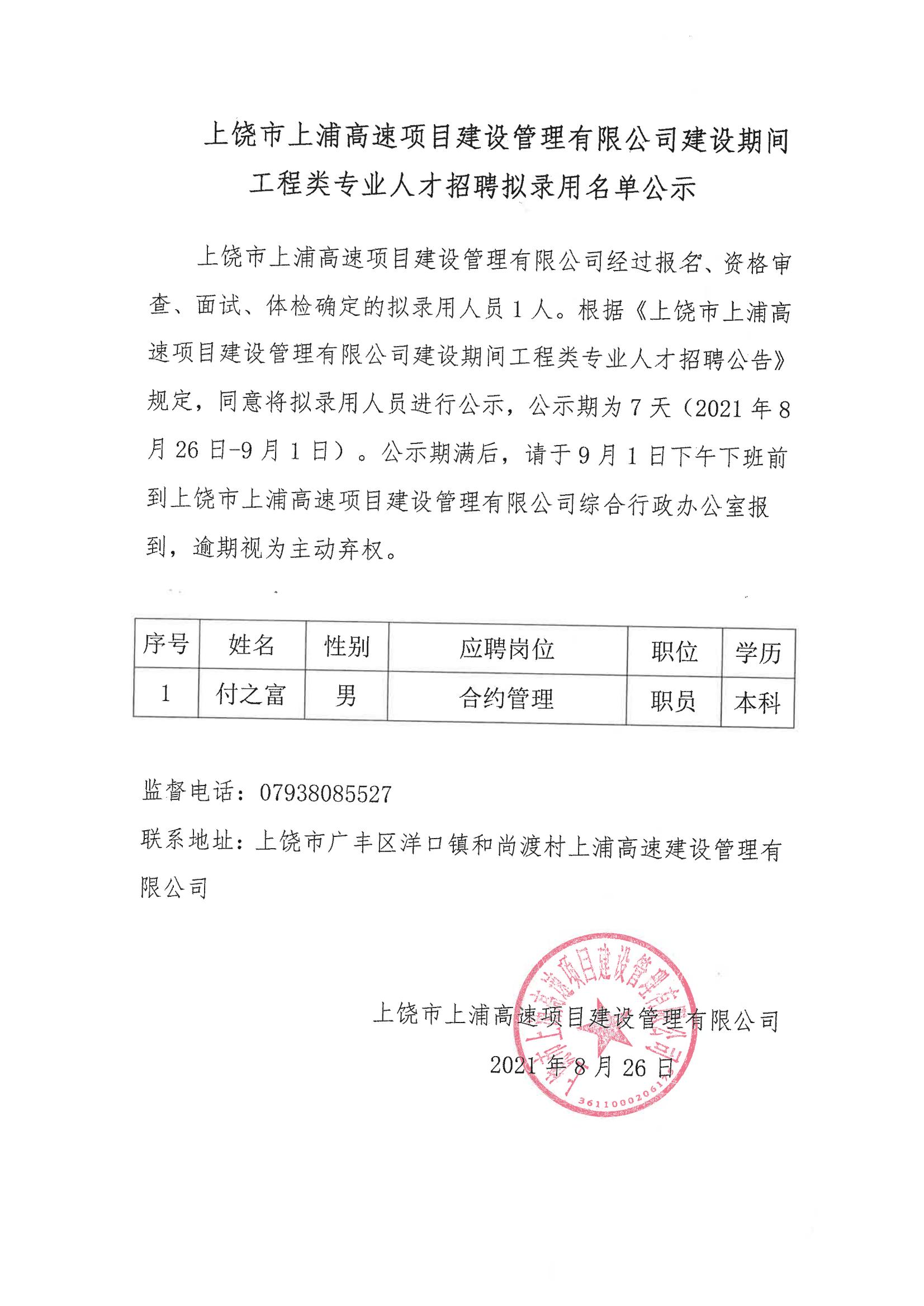 上饶市上浦高速项目建设管理有限公司建设期间工程类专业人才招聘拟录用名单公示