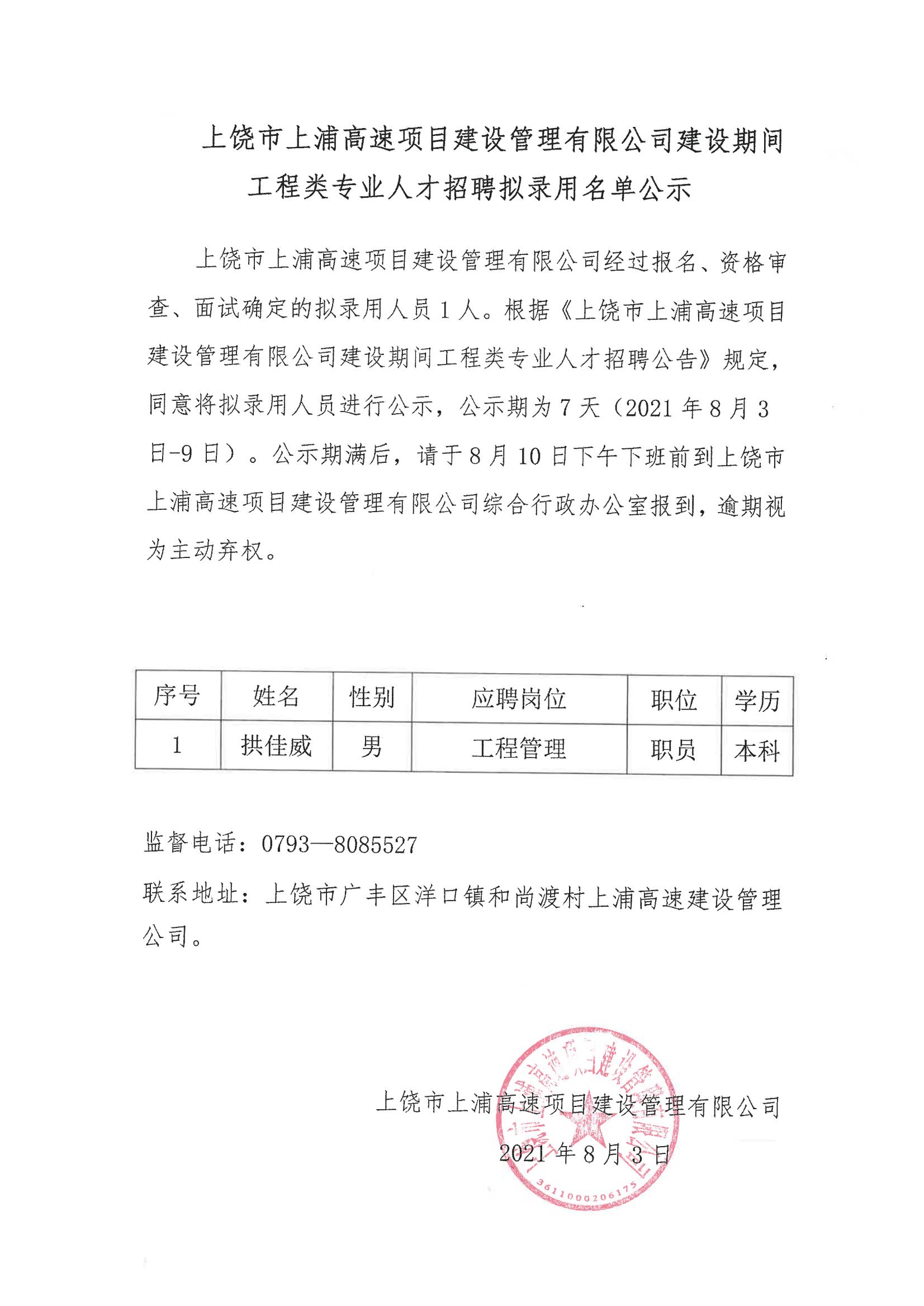 上饶市上浦高速项目建设管理有限公司建设期间工程类专业人才招聘拟录用名单公示