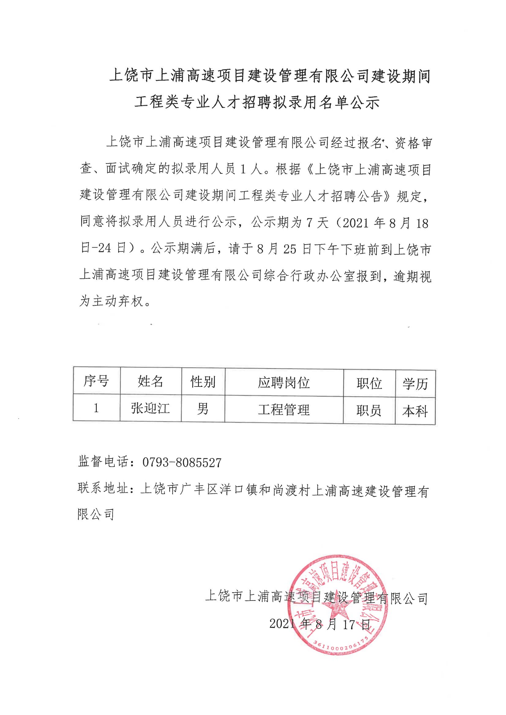 上饶市上浦高速项目建设管理有限公司建设期间工程类专业人才招聘拟录用名单公示